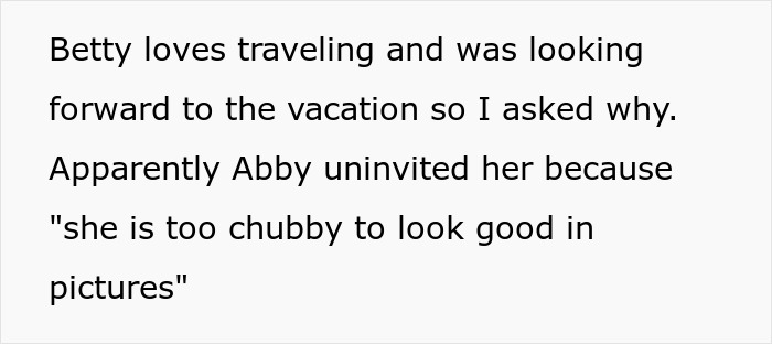 Load More Replies...The mother is absolutely right in canceling the holiday after the daughter body-shamed her friend. It's called parenting. I don't understand why the daughter - who knows what it's like to be overweight and body-shamed is now an a*****e to her friend.