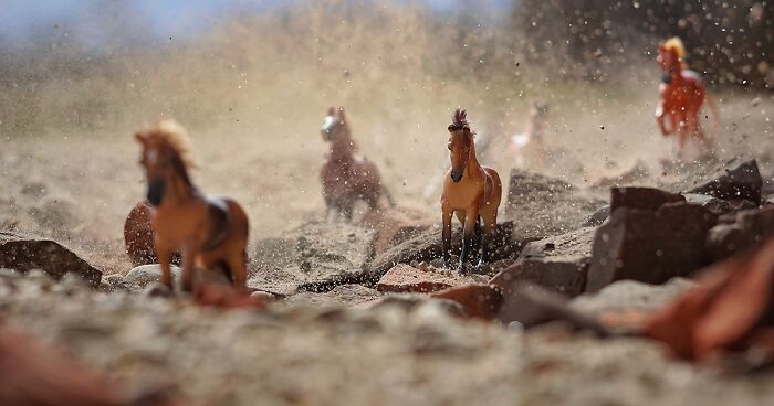 Watching kids, I noticed how they are able to create visual images in their minds while playing and how the toys came to life in their hands. So, I tried to capture those images with my camera and found a new perspective (quite literally, actually) of the situation and looked at the world in the way my kids do daily. It started as a fun game for me and my kids to create these little stories, by searching for perfect locations. And so, the patch of land became a desert, young grass turned to the jungle, an anthill for us looked like a battlefield. All the toys came to life.