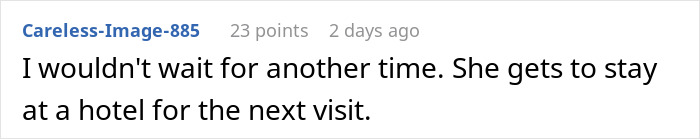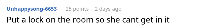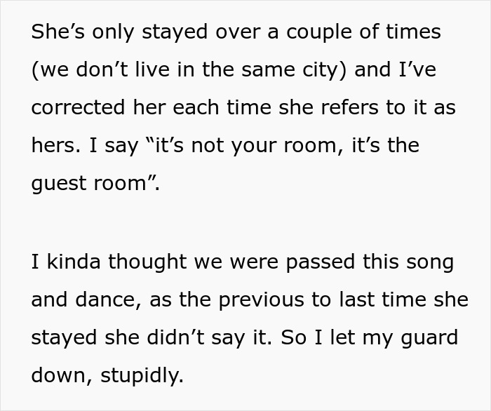 Load More Replies...I'm afraid I just don't see the issue of her saying it's her room.. she always uses it when she visits, you even said "technically true" when she mentioned nobody else has used it... and are guests not allowed to use your spare closet in your spare room? when on vacation and you are staying at a motel/ hotel, do you refer to that room as your room or do you always refer to it as the motel's room? Like "it's getting late, let's go back to the Holiday Inn's room"? I personally don't see any issues here at all.. sounds like an overreaction to me.