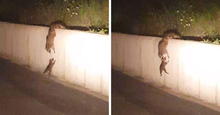 Police officer Chris Williams was working security near a high school in Camdenton, Missouri, when he spotted a raccoon family looking suspicious. When he came closer though, he witnessed the sweetest moment of the night – the whole raccoon family teamed up to help a raccoon baby get over the wall.