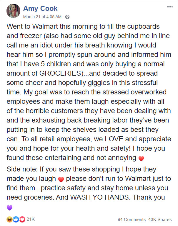 Mother-of-five Amy Cook, who lives in Findlay, Ohio, decided that the employees at her local Walmart needed some cheering up. That’s why she stuck dozens of witty and wholesome sticky notes all over the supermarket.
