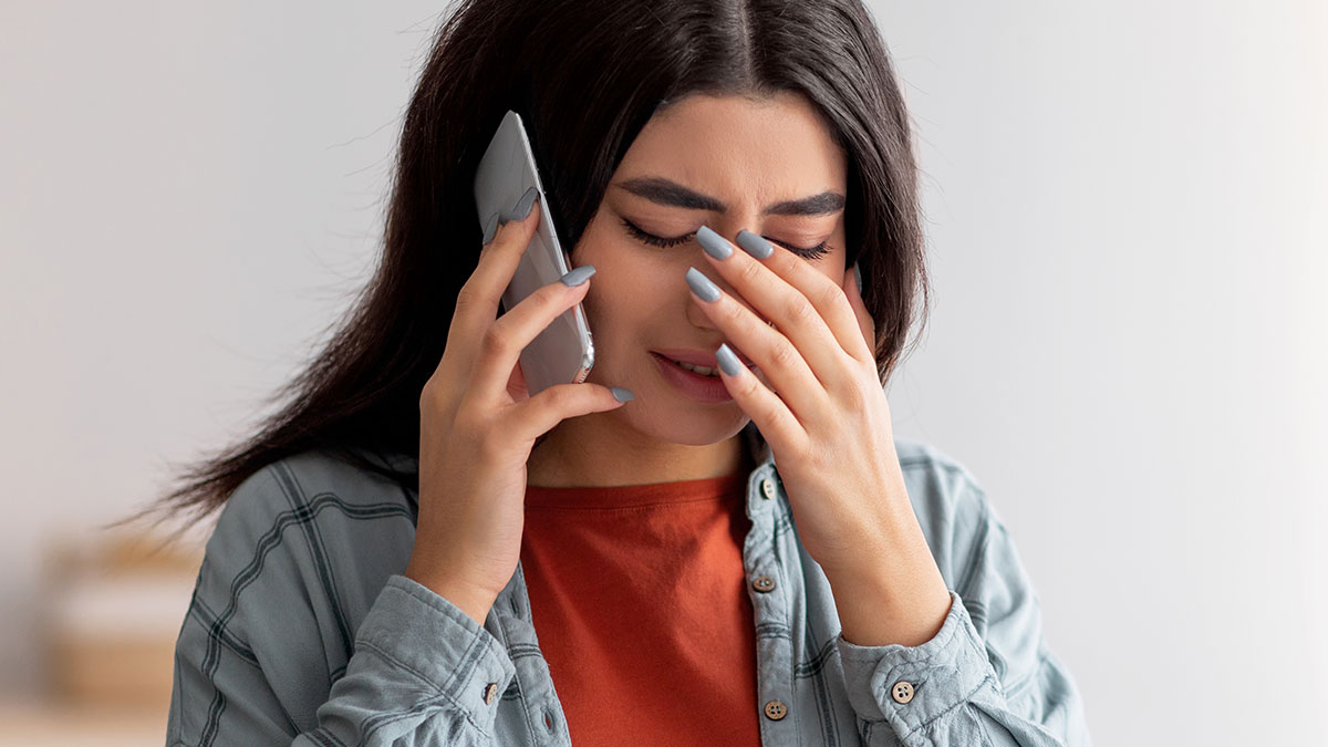 Young woman upset while on a phone call, reflecting emotional distress related to mom blaming daughter in divorce conflict.
