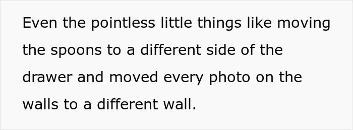 Little did she know what was about to happen next. As her mom and stepdad came to visit for a few days when she was all settled in her new flat, she came home at 11 pm after working a late shift and found nearly all of the furniture moved around, books and kitchen stuff rearranged. Even the woman’s bed was moved in such a way that the door hit it when she entered her bedroom.