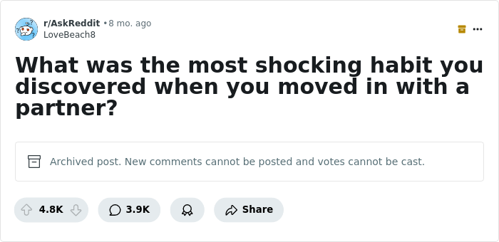In this online thread, people had to pick just one. They told their stories to one netizen's prompt, "What was the most shocking habit you discovered when you moved in with a partner?" I'll admit, some of them are quite quirky and heartwarming. Other partners, however, deserve jail time for their nasty tendencies.