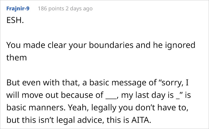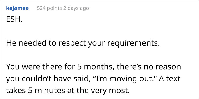 Some redditors thought that the OP was right to move out as the roommate didn’t respect his boundaries that he very clearly set and explained the reasons for it. Also, they considered taking someone else’s food stealing and didn’t think there was any obligation for the OP to be polite to the roommate upon leaving him.