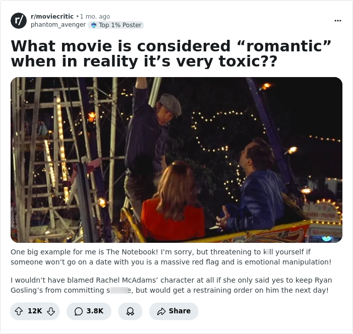 So, they came to Reddit for some insights. "What movie is considered 'romantic' when in reality it's very toxic??" they asked. And film enthusiasts had some unexpected picks.