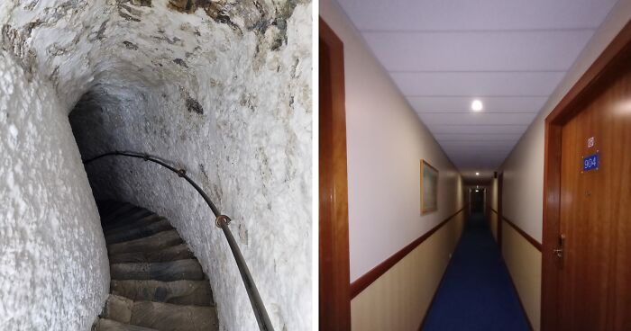 A narrow stone staircase descends into a dimly lit liminal space with rough white walls.