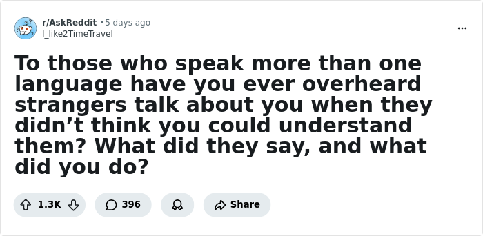 For example, talking about a person while you're near them, but using a language they don't understand. Or at least you hope they don't. Because stories of those folks understanding it happen often enough. So, today, let's jump in to read them, shall we?