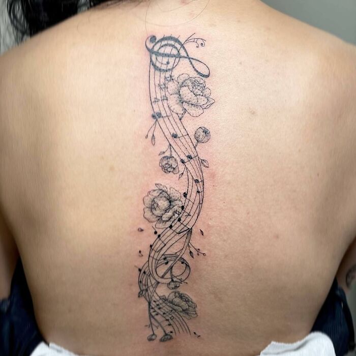 Music And Flowers Spine Tattoo
