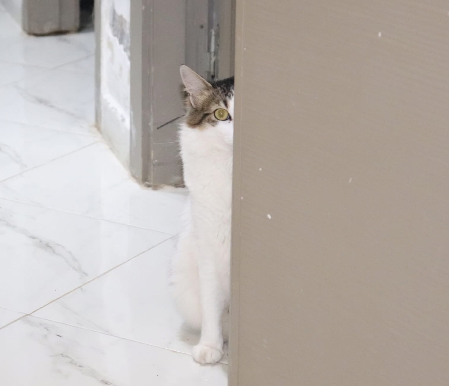 My cat, Nahda, peeking from behind the door with just one eye showing, looking exactly like a little spy on a secret mission.