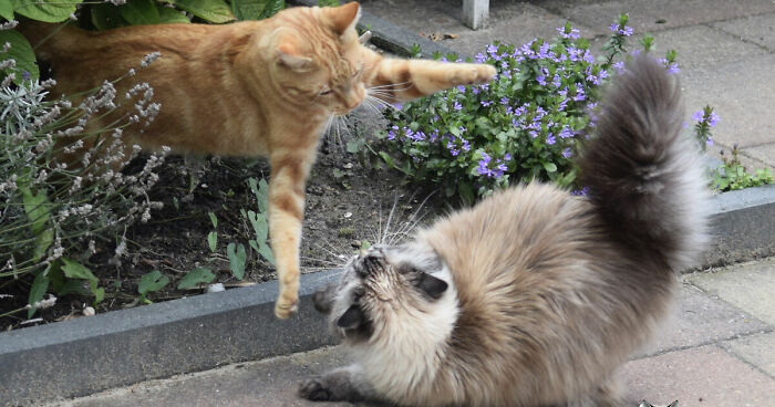 Ever since Brutus, our neighbor cat, came into our garden he and my cat June have been playing ninja nonstop. What started out with getting to know each other by gently sniffing changed into epic ninja battles they share almost every day. And once my Jazz was allowed to go outside, she instantly wanted to join the pawty.