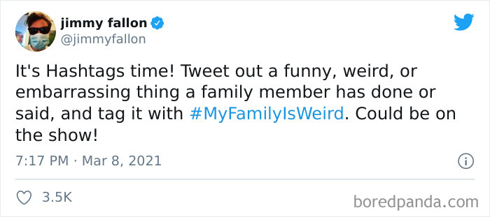 It’s Hashtags time, dear Pandas! The one, the only, the irresistibly humorous Jimmy Fallon is once again making us smile, giggle, and chortle when we’re supposed to be working or studying. This time, the critically acclaimed comedian has asked his loyal fun-loving followers to share the funny, weird, and embarrassing things that their family members have done or said. Naturally, when Fallon asks you to jump, you ask, “How high?” So people responded by posting under the #MyFamilyIsWeird hashtag, much to everyone’s amusement.