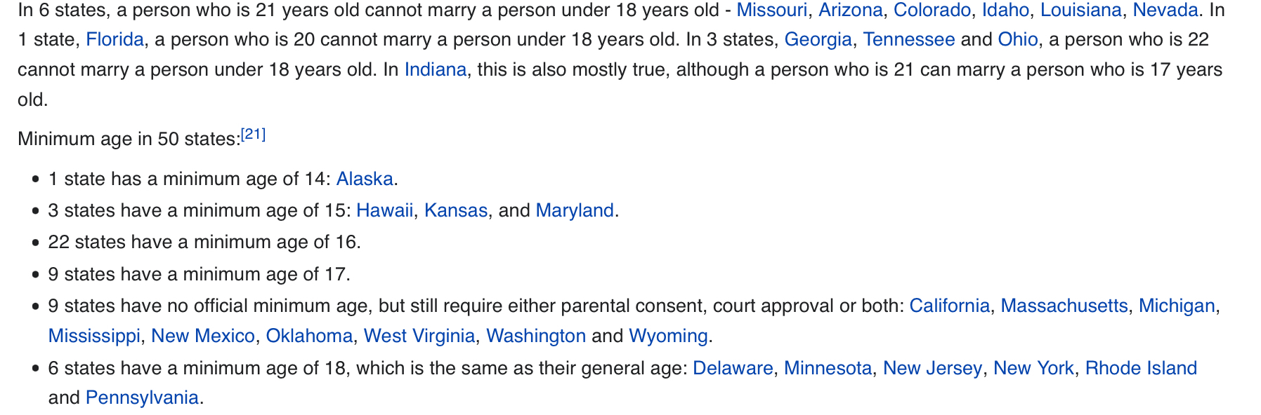 Child marriage is still legal in most U.S. states and about half of those have no minimum age requirement. It's predominately southern states where this happens and is usually religious (Christian) parents arranging or giving permission. Most cases are a teen girl marrying an adult man.