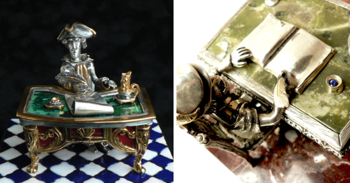 Art tendency that I create is quite rare, it’s called “Plastic Arts”, which is something in between sculpture and jewellery. This field demands extremely high professional skills, which are achieved by practice and hard work. I am working both with bronze, brass and precious metals – gold and silver. I also often use glass enamel, it is very sophisticated process, where high temperatures are used to smelt coloured enamel and cover it on metal. I have discovered my own methods, how to coat my figurines with enamel. Art pieces are made exclusively only by hand, no computer simulation is used.