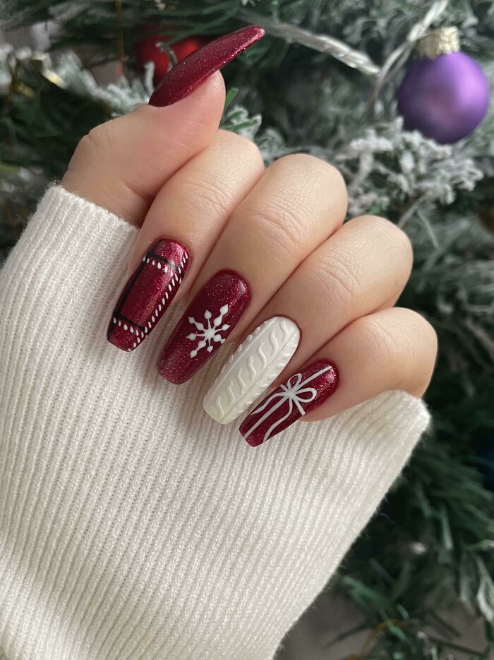 Festive nail art with red glitter and white winter patterns, featuring snowflakes and gift designs.