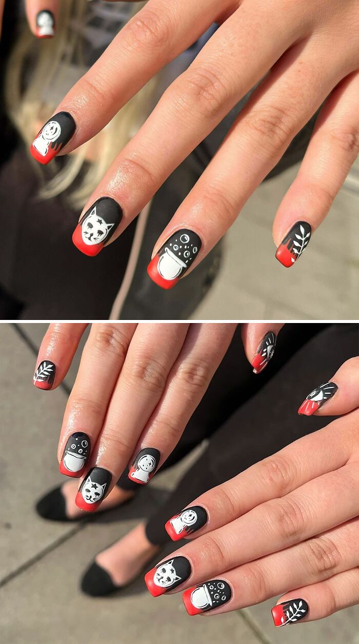 Nail art ideas with black and red designs featuring cute animal patterns and graphic elements.