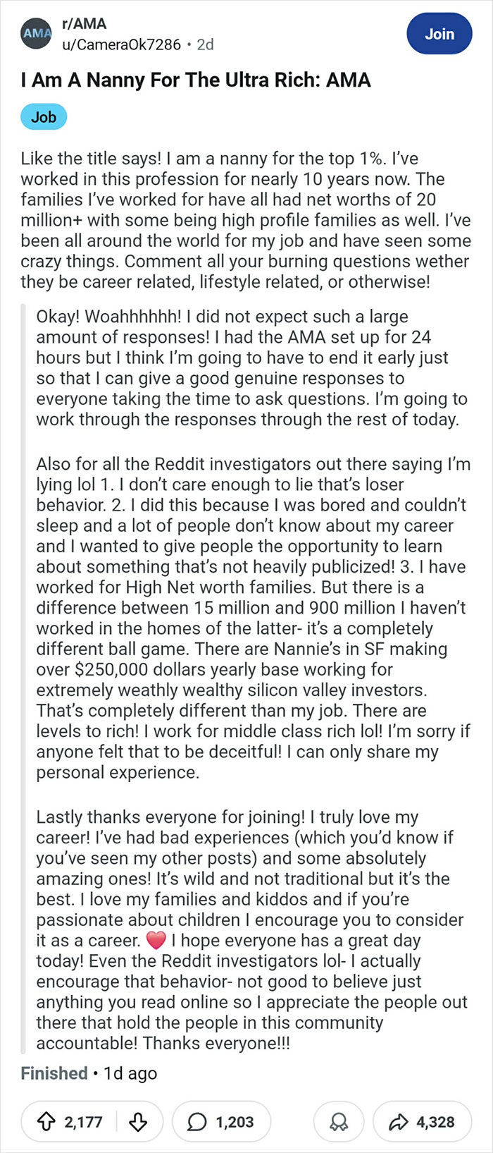 Luckily, we can get a closer look. One nanny who works for the ultra-wealthy recently took to Reddit to answer people’s burning questions about her job and what the world of the top 1% is really like. Read her candid responses below and upvote your favorites.