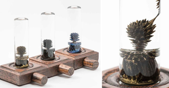 A fascinating characteristic of ferrofluid is its ability to follow the grooves on a magnetized piece of metal. This is the classic, “Magnetized bolt experiment”. It’s incredibly satisfying watching ferrofluid spiraling around the grooves. The passive ferrofluid bud is equally as impressive from an aesthetic point of view. Blending high technology nanochemistry and old-world craftsmanship, the Nano Tree will subtly complement any living or workspace.