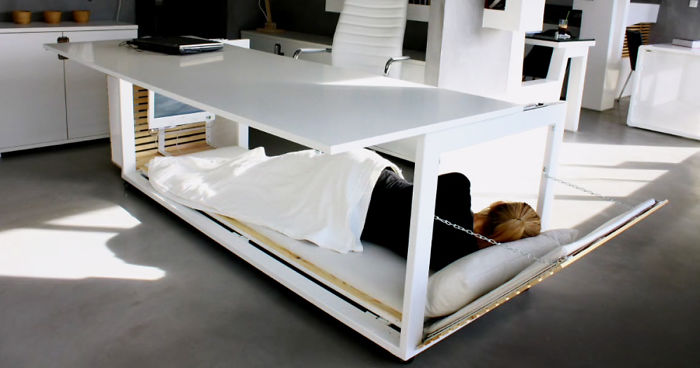 Modern furniture not only has to be of a sleek design but often also perform multiple functions as people seem to be valuing ‘less stuff, more independence’ way of life. Greek design company Studio NL has just the ticket – a “nap desk” that lets employees sleep at work without any shame or discomfort. Not only the table design can make your workday more bearable, but it also saves office space and gives you your personal hideout. Not to mention it performs as a work table, too.