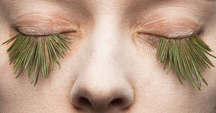 Eggs and snow formed the glue to attach the false lashes to the eyelid. Scavenged foliage from a local forest was used to create the fake lashes. Each eyelash took about an hour to make demonstrating it is time-consuming to craft completely natural makeup looks. The lashes themselves have a shelf-life of about 24-hours before they start to wilt and fall apart.