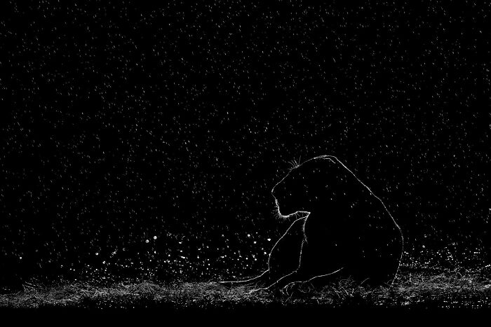 "The photographers were observing a pride of lions and saw them respond to the rain in their own way. While some of the cubs continued their play with renewed vigor, others tried to seek shelter close to their mothers. The mothers, in turn, sought refuge where they could in the open savannah. But this lioness stood out from her pride, as she stayed put in the rain."