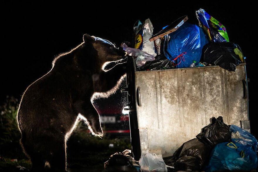 Dozens of locals drinking beer, waiting for the sun to set and the bears to come out. Surveillance in their cars to find the bears, screaming, shouting and lighting fireworks. I was overwhelmed by everything that happened. Over the years I went back to the same campsite and one night everything came together. The cars in the background, the people next to me who shine their flashlights and a beautiful bear who model-like tilts an overloaded bin. It created the perfect studio setting for me.