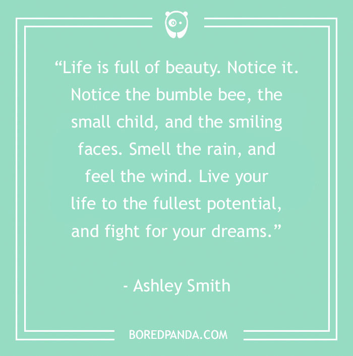 “Life is full of beauty. Notice it. Notice the bumble bee, the small child, and the smiling faces. Smell the rain, and feel the wind. Live your life to the fullest potential, and fight for your dreams.” - Ashley Smith