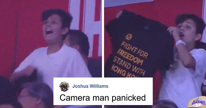 One little fan of the game has found a brilliant way to share his take on the difficult subject as well. At the Lakers-Clippers game on the NBA’s opening night, he proudly held up a Clippers T-shirt during a break and when the dance cam put him on the screen, he suddenly switched to a Hong Kong protest shirt before the cameraman could pan away.