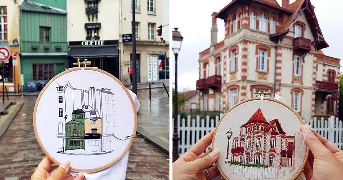 These French-Swedish textile artists travel together across Europe's most favorite places to visit and create charming embroidery designs inspired by the architecture of European cities. Using their embroidery art, they recreate their memories together - travels, favorite streets, and buildings which they find in different cities.