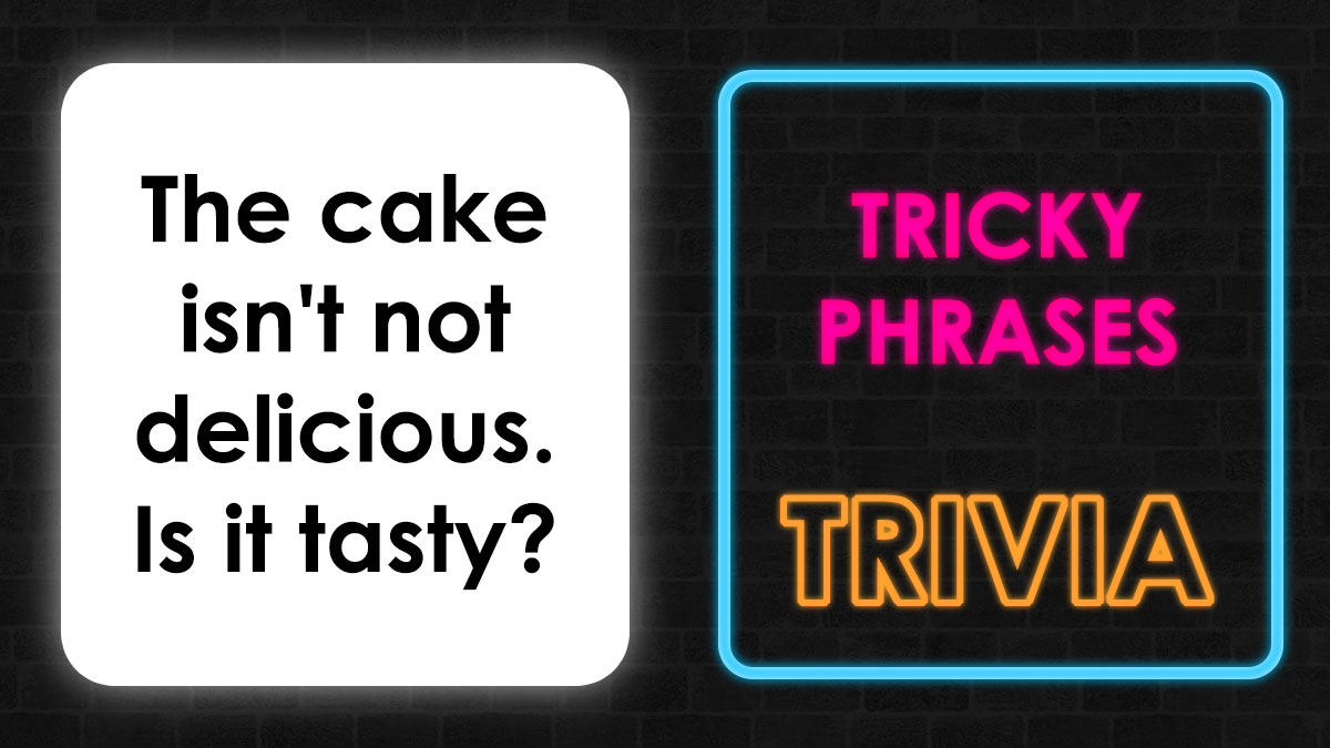 Bright neon sign reading tricky phrases trivia next to a language quiz question about tricky sentence structure and meaning.