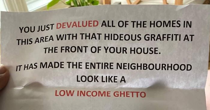 Load More Replies...“Low Income”. Maybe they should just paint “I’m comfortably well off” their garage if that’s the kind of message they want to send. Same type of person would probably brag that they’ve seen a Banksy.