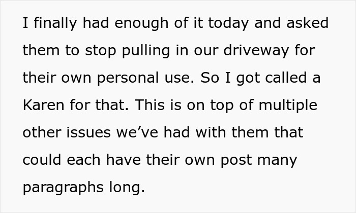 Their habit of using the OP’s driveway as a turning lane, quick pit stop, and occasional hangout spot was the final straw. And the worst part? When politely asked to stop, these neighbors whipped out the ultimate comeback: calling our homeowner a “Karen.”