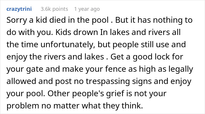 On the other side of the fence, you have the family who was very practical about buying the house with the pool. “Normally it would have been out of our price range, but this one was a great deal. The reason why was because one of the neighbor’s children had drowned in the pool last summer,” the OP wrote.
