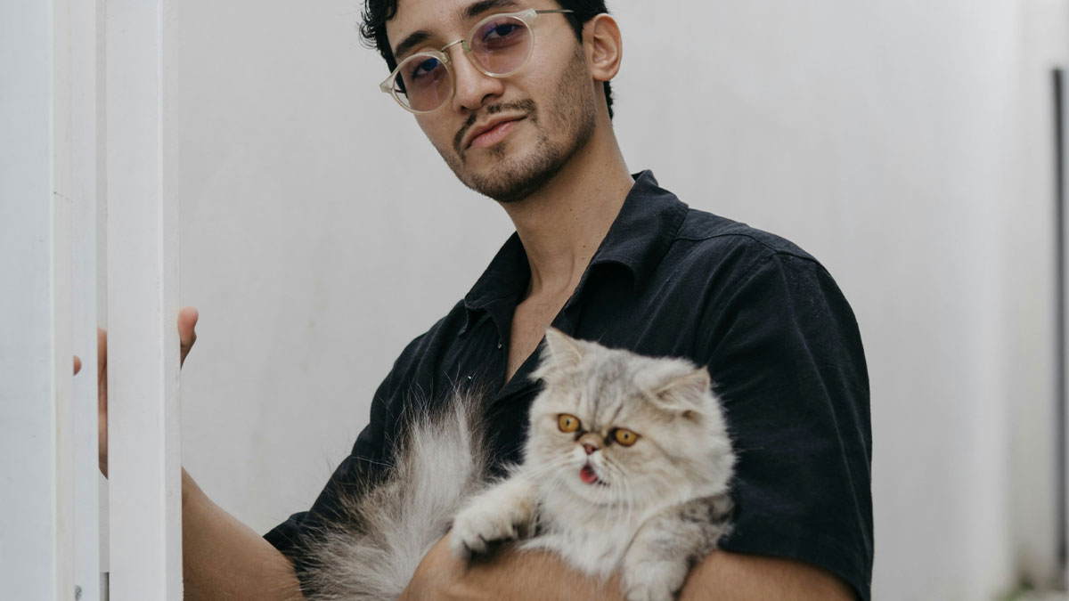 Man holding a fluffy cat outside a white building, illustrating a cat disappearing for days and being adopted by a neighbor.