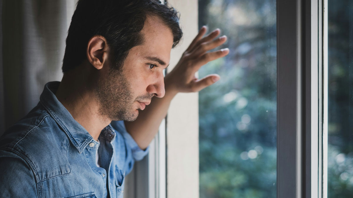 Man in a denim shirt looking out window concerned about nightmare neighbors secretly using family’s backyard without permission