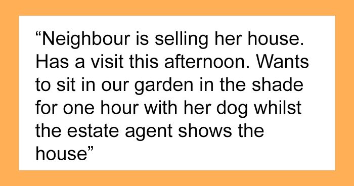 Load More Replies...Does the park allow dogs? that might be a reason why she can't go there. Or it might be the dog doesn't get along with people or other dogs. OP said the neighbour got rid of her car in the comments, maybe the park is too far to walk to for any number of health related reasons. I'd probably let her sit in my yard as long as she cleaned up after the dog. But, its OPs property so I guess they get to decide who sits in their yard no matter how unreasonable it makes them.