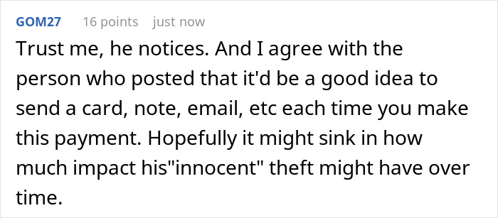 The author of the Reddit post wrote that he’d been withholding birthday and Christmas cash gifts from his nephew, sending the money to his mom, instead. It’ll still take a few more years for the entire debt to be repaid. What’s more, it’s not even clear if the kid will realize that he’s being punished for what he did.