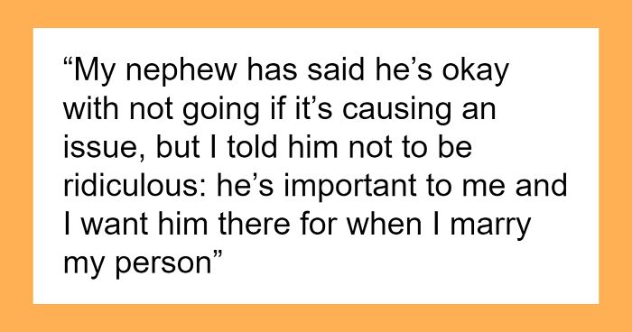 Load More Replies...Brother needs to understand - he might not be the father, but he's the Dad and he needs to suck it up. Nephew is OP'S family, and OP can invite whoever he wants to his wedding (partner agreeing, of course). Put nephew in the wedding; he could be a groomsman or "brides-man", and sit at the main table. Brother can sit at the Children's Table, since he's acting like one.