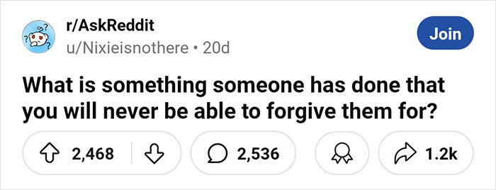 User u/Nixieisnothere sparked a brutally honest conversation on r/AskReddit after asking everyone to share the very worst things people have done to them that they would never forgive them for. We’ve collected some of their most candid stories to share with you. Scroll down to read them and possibly lose a bit of your faith in humanity.