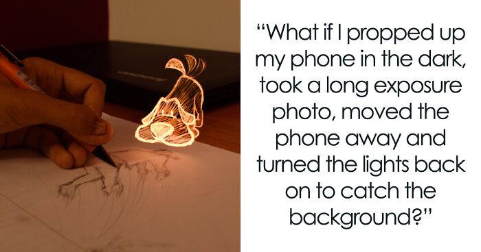 I thought about how long exposure works, the camera just keeps on recording light until I press the button again. So when there is no light, it’s not recording anything, right? What if I propped up my phone in the dark, took a long exposure photo, moved the phone away, and turned the lights back on to catch the background? That was it, I had done it! I made interesting photos of a floating hologram using just my phone. Then I thought, hey, I’m an illustrator, I can draw my own holograms, take photos of those and tell a story through these beautiful photos, create a series.