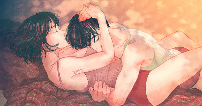 The Artist is best known for her illustrations of a loving couple. Zipcy draws her pieces using Photoshop. "I do all of my drawings with Photoshop. The series schedule is tight and I have to work fast," she said. "It can take as little as one day to finish an image if I work fast, but it usually takes two days. Sometimes when I am dissatisfied with a drawing, I struggle with it for a week."