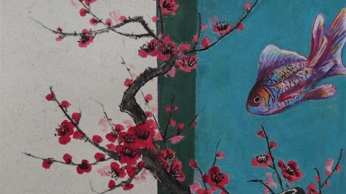 Her process often begins with semi-processed rice paper upon which she paints traditional motifs such as plum blossoms, birds, or goldfish using ink and mineral pigments. These classical subjects function not only as aesthetic anchors but also as conceptual gateways for a broader exploration into the evolving relationship between nature and human culture. Through layering acrylics, colored pencils, and sculptural textures, Yu introduces abstract elements that evoke technological systems and post-human landscapes. For example, a fish may swim not in water but across a teal-painted wall, while a delicate branch might extend into a fragmented architectural interior. These intentional visual disruptions reflect the fractured ways nature is often perceived in the contemporary world, filtered through screens, reconstructed by memory, and reshaped by artificial environments. Yet rather than creating conflict, these elements achieve a striking coherence by balancing the organic and the synthetic, the ancient and the futuristic. In this way, Yu’s work becomes a space of reconciliation where traditional motifs and speculative forms coalesce to articulate a vision of nature that is both timeless and radically contemporary.