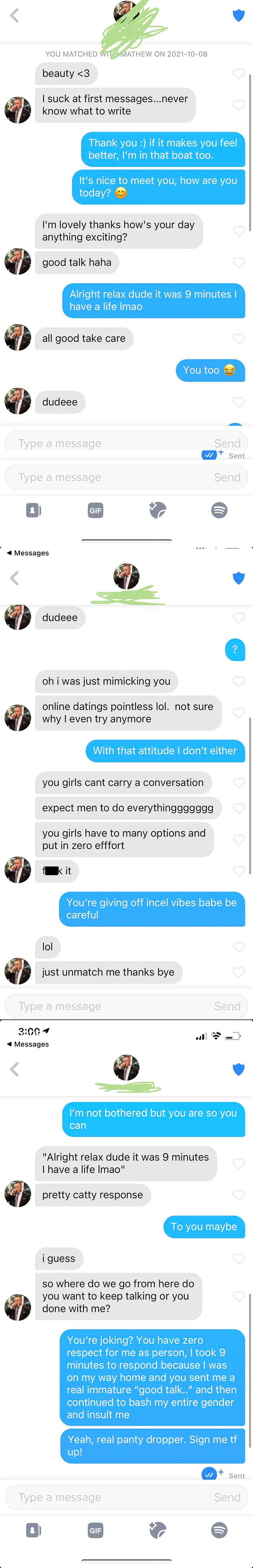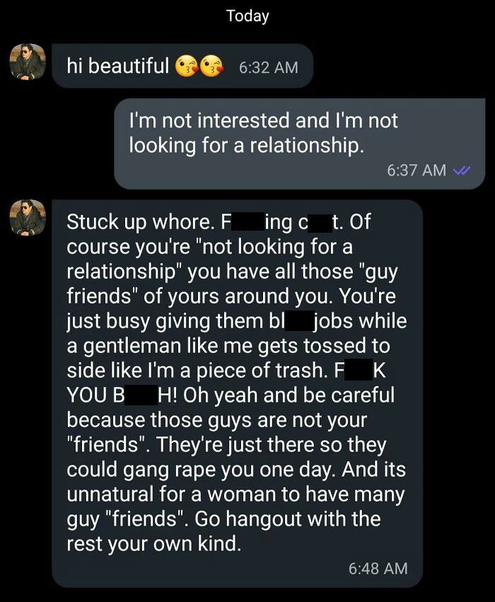 I stopped after 9 I think. So much "I'm good, great, faaaaaanfuckingtastic" and she said NO. Then it's B!tch, c*nt, wh0re and other nasty words. Even threatening enough to wanna call the cops. Just a few days ago there was a "Heck Yeah" response for all the people here on BP who have had this happen to them. I stopped counting the responses and votes, Way too many which is very alarming. This makes me furious and sad and frustrated at the same time and I hate that feeling.