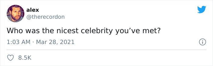 There are certainly stories of unpleasant encounters with well-known people. However, there are many stories of heartwarming encounters too. Twitter user @therecordon was interested to know who was the nicest celebrity people have ever met.