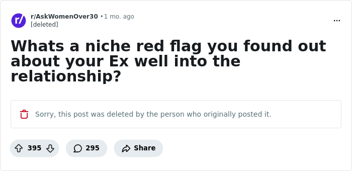 I never would have guessed that the spectrum of red flags was so broad. One post will be like "He kept me locked in a closet for 20 years" and the next is "His pants were too nice".