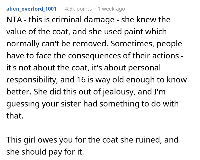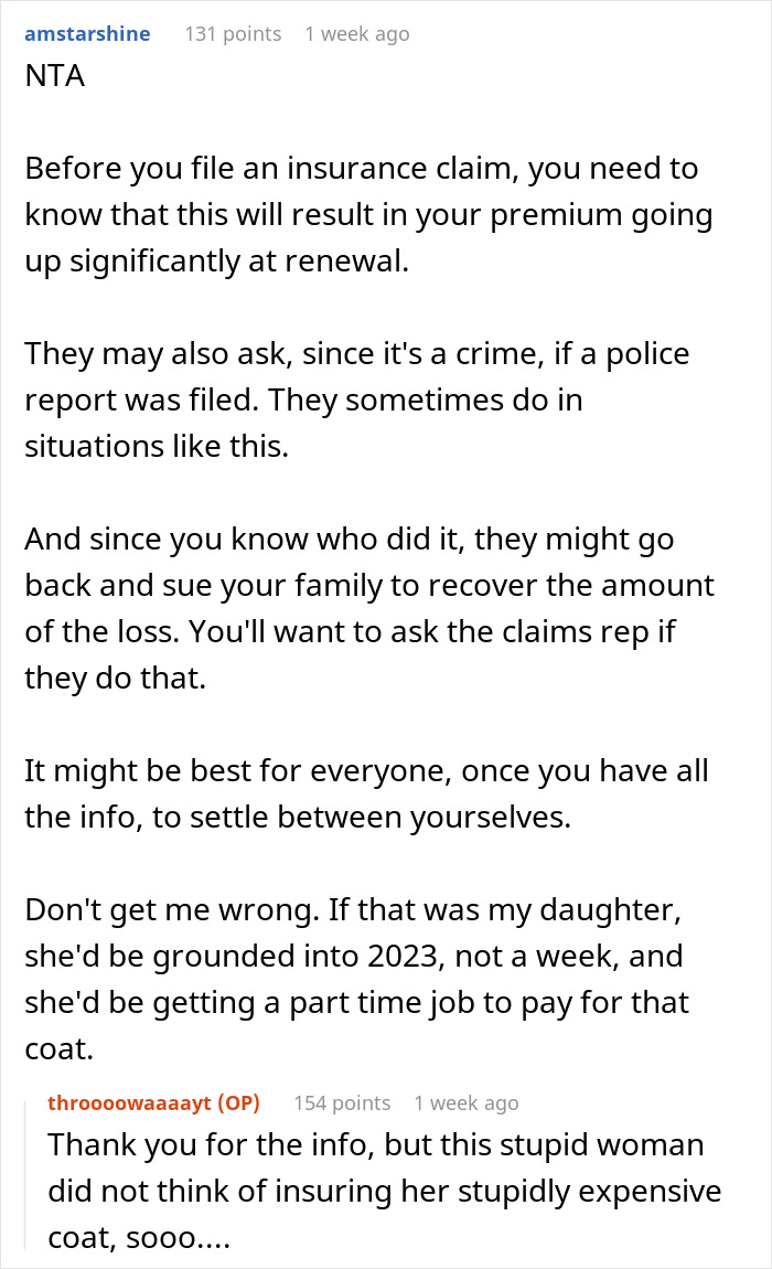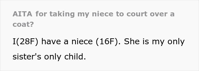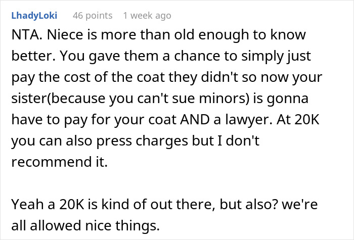 Not all 16-year-olds have a great understanding of money, but one would think that a teen would consider $20k to be even more than it is. This girl likely has much less than that amount in her bank account, so throwing it down the drain by destroying this coat is shocking. When it comes to how the aunt decides to respond to the coat incident, legal action seems appropriate. However, engaging in a legal battle is expensive and complicated, especially when trying to sue a family member. Technically, one can sue a minor, but they typically don’t have much money, and their parents might not be held responsible for their actions.