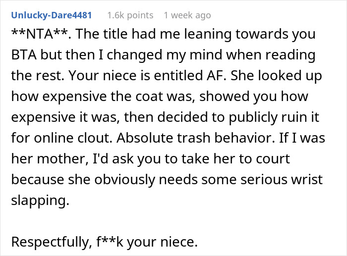 This woman is wondering if it would be wrong to sue her niece for ruining an expensive coat on purpose