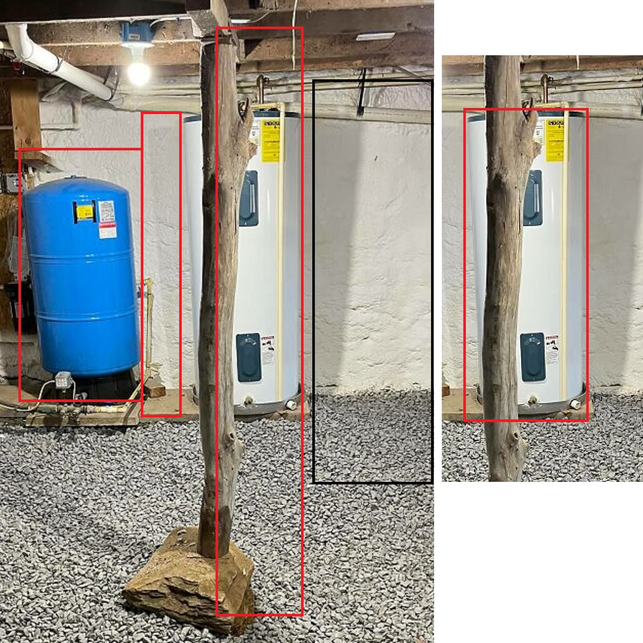 Not at all uncommon in old houses. The main beam in my basement is supported by 4 logs that are about 7" in diameter. That's a cross-section of about 38 square inches and each square inch should support a minimum of 1000 pounds. The right side of the water heater is parallel to the picture framing and the centerline of the log/post. The left side of the water heater is about parallel to the pressure tank, but not parallel to the right side of the water heater. Something looks a bit off, but I think that post is close to plumb and not a problem. Picture next.