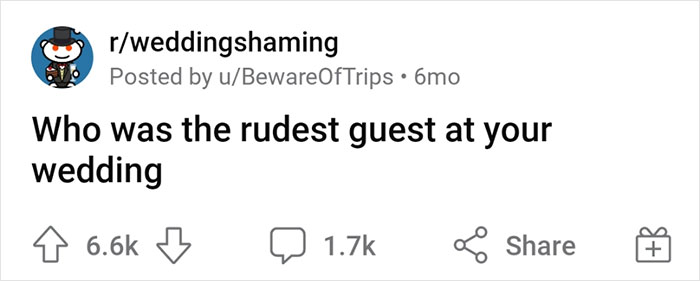 So to better understand these mishaps, Redditor BewareOfTrips started up a thread asking: "Who was the rudest guest at your wedding?" Fellow members over on 'Wedding Shaming' opened up about the worst behaviors they witnessed, detailing firsthand tales of awkward, vile, and jaw-droppingly impolite incidents from their big day. We at Bored Panda have gathered some of the most surprising responses, so be sure to read them right below. And if you have any similar stories to share, let us know about them in the comments!