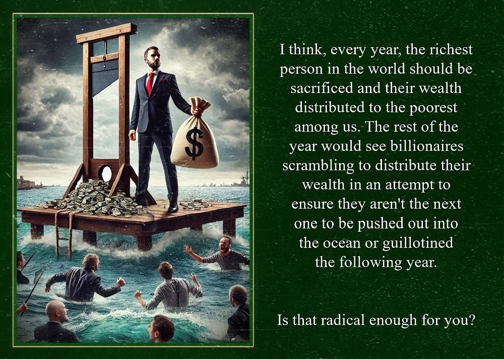 Throw in the one-percenters for good measure and redistribute their wealth where it’ll actually do some good— for example, do NOT use it to build any more d**k rockets—-then even more of the world’s problems will magically be resolved.